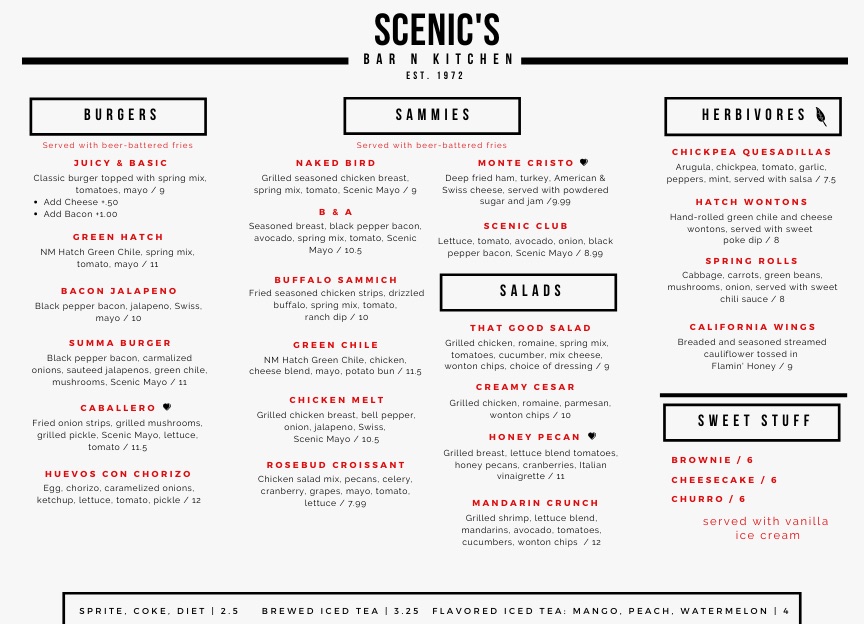 Welcome to Scenic’s Bar N Kitchen, a vibrant culinary gem nestled in El Paso, TX. Known for its inviting atmosphere, this restaurant perfectly blends delicious flavors with a friendly environment. The menu is a delight, featuring standout dishes such as the Scenic Burger, a hearty 1/2 lb patty topped with savory ingredients, and the Artichoke Hatch Pasta, a creamy blend that will tantalize your taste buds.